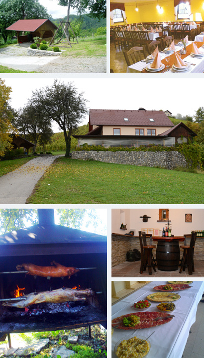 The restaurant can accommodate 80 people, the indoor part of the house can accommodate 90 people, and the outdoor covered part can accommodate 140 people. Inside, there is a stove where you can roast a calf, a lamb or home-made chickens outside. The outside area is very suitable for picnics, cold-hot buffets and we also organise wine tastings in the cellar. The cottage also offers accommodation for up to ten people.